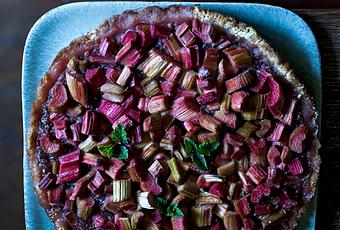 Pour la tarte à la rhubarbePour la pâte : 125g de beurre salé / 250g de farine / 130g de sucre, moitié blanc moitié rouxPour la garniture : un bouquet de tiges de rhubarbe / un bouquet de menthe fraîcheLa veille, faire dégorger la rhubarbe dans du sucre. Préparer la pâte sablée : dans une casserole faire fondre le beurre, y ajouter le sucre, puis la moitié de la farine. Hors du feu, verser le restant de farine, compléter éventuellement en quantité de farine, de façon à obtenir une pâte friable tout en restant souple. Disposer la pâte en la soudant avec les doigts dans le moule à tarte préalablement recouvert de papier sulfurisé. Passer à blanc à four chaud dix minutes pour éviter que la pâte ne boive le jus de la rhubarbe. La recouvrir de la rhubarbe, et la remettre au four 20 min. Une fois sortie, disposer les feuilles de menthe, laisser refroidir afin que la pâte durcisse, puis glisser sur un plat à tarte.