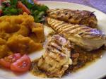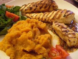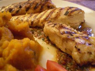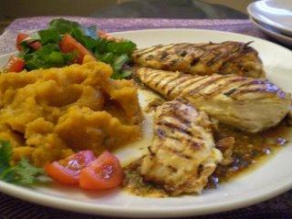 Au moment de servir : faites griller le poulet sur un grill ou au four, a mi cuisson versez-y dessus le reste de marinade. Pour servir disposez dans chaque assiette une tortilla tiède. Recouvrez de ¼ de la sauce et disposez dessus un morceau de poulet. Servez avec le reste de la sauce.Idée d’accompagnement : purée de patate douce (comme ici), une pomme de terre au four (ou une patate douce au four…c’est super bon), une petite salade…