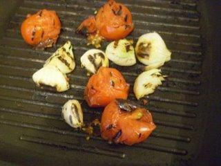 Pour la sauce : il s’agit ici de faire griller les ails, tomates et oignon sur un gril (ou idéalement un comal : plancha spéciale pour la cuisson des tortillas). Cette technique est très utilisé au Mexique et en amerique centrale : elle donne un petit parfum fumé très agréable a de nombreuses préparations (chirmol, pepián, salsa de chile pasa…). Faites donc griller vos légumes au grill ou sur une poêle a sec, jusqu'à ce que la peau soit noire et couverte d’ampoules. Laissez refroidir jusqu'à ce qu’ils soient maniables. Pelez ensuite vos légumes, (ce n’est pas grave si des petits morceaux de peaux restent, ca donnera un petit gout fumé) et passez les au mixer jusqu'à obtenir une sauce homogene. Joutez le reste des ingrédients de la sauce, mixez a nouveau et réservez.