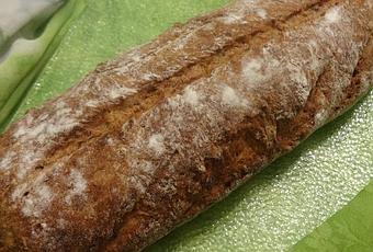 8- Déposer la pâte dans un moule ou sur une plaque couverts de papier parchemin et laisser lever pendant une quinzaine de minutes. Saupoudrer la pâte de farine tout usage et la grigner à l’aide d’un couteau. Enfourner pendant 30-40 minutes à 200°C / Put the dough in a pan or a baking sheet lined with parchment paper and let it rise for about 15 minutes. Sprinkle the dough with all-purpose flour and score it with a knife. Bake for 30-40 minutes at 200°C / Colocar la masa en molde u una bandeja forrada con papel pergamino y dejarla subir por unos 15 minutos. Espolvorear la masa con harina común y con un cuchillo hacerle unos cortes. Hornear durante 30-40 minutos a 200° C.