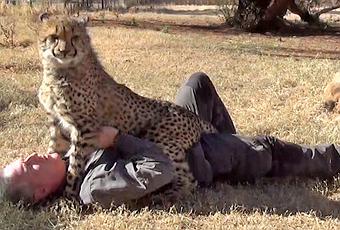 Dolph Volker adore les chats, sauf qu’il les prend relativement sauvages et plutôt imposants. Il nous en fait la démonstration avec un gros câlin à Gabe, le guépard qu’il a élevé dès sa naissance. Le commun des mortels risquerait de perdre un ou deux bras mais pas lui, quel homme !