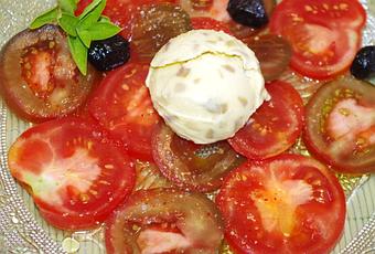 Pour le carpaccio : 8 tomates anciennes de couleurs différentes - huile d'olive - vinaigre de framboise poivron-piment-d'espelette- 1/2 bouquet de basilic - 12 olives noires - sel et poivre