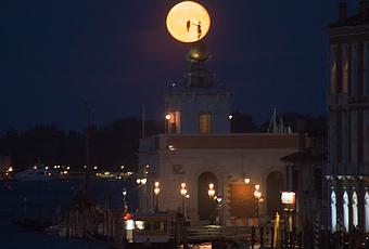 J'ai fait cette photo par hasard le 30 août vers 20:30, la pleine lune était positionnée juste derière la girouette de la Dogana del Mar. Je n'avais pas le trépied pour réaliser une photo de qualité.