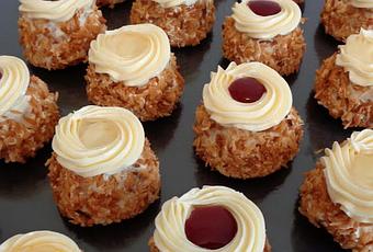 Voici des petites mignardises très simples à réaliser. Un petit gâteau à la noix et au lait de coco, recouvert de crème au beurre, et roul dans la noix de coco caramélisée. Pour la finition une simple couronne de crème au beurre est remplis de gelée de framboise ou de gelée de citron.