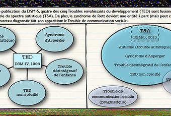 Le Trouble du spectre autistique, appelé aussi Trouble du spectre de l’autisme ou plus simplement autisme, est un trouble du développement. Les premiers signes se manifestent en bas âge, mais l’impact au quotidien peut ne devenir évident que plus tard, vers l’âge scolaire par exemple. L’autisme, tel que défini par le DSM-5, est caractérisé par deux catégories de comportements atypiques. La première catégorie concerne la communication sociale et les interactions sociales, alors que la seconde touche les aspects restreints et répétitifs des comportements, intérêts et activités.Source iconographique et légendaire: https://aqnp.ca/documentation/developpemental/le-spectre-autistique/