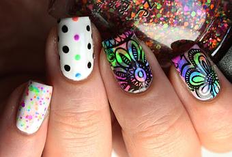 Je ne sais pas trop par ou commencer. En soit, il est plutôt simple. Un peu de tamponnade à l'éponge, du stamping avec une plaque BornPrettyStore, un peu de paillettes et le tour est joué. Ce sont des paillettes China Glaze de la dernière collection (le nom m'échappe). Il y en avait de rose/orange et des multicolores. J'ai craqué pour les deux et suis déçue. Pas par les multicolores qui sont parfaites, mais par les autres, qui ont décolorées (ou plus colorées) la base. Comme les vernis Lush Lacquer!par contre pour les multicolores c'est un sans faute, vous les voyiez ici posées sur du blanc!