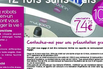 Il manquait une information importante qui va en ravir plus d'un(e), celles et ceux qui hésitaient encore : Opération 12 fois sans frais que ce soit pour le Cook'in, le i-Cook'in ou le Méga Pack du 1er septembre au 8 décembre 2015 !! D'autres financements vous sont bien sûr proposés.