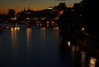 Songeur, je suis le cours de l’eau. Me voilà au Pont des Arts. Je m’appuie au parapet pour la regarder couler. Jamais, sa surface n’est au repos, toujours elle vibre. Les lumières s’y brisent et se fragmentent. Chaos sans logique, aucun repère à suivre. Quand un projecteur éclaire un mur, l’éclat est lisse et habille la paroi de sa couche. Mais sur l’eau, rien de tel. La lumière ne l’habille pas, elle y est détruite, désagrégée. Le flot se joue des photons, et les renvoie de toutes parts. Billard à mille bandes.