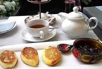 Petit-déjeuner Russe (25 €) comprenant, jus de fruits, sirniki et ses confitures russes, une viennoiserie, café ou thé. Coupe de champagne ou vodka (9€) en supplément.