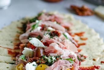 - Au centre de la pâte à pizza, étalez sur toute la longueur la tomate concentrée, ajoutez ensuite les ingrédients en alternant - mozzarella, tomates séchées, tomates cerise, tomate, jambon de Parme, basilic ciselé.