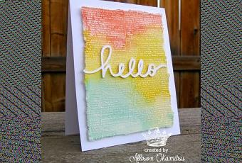 -Soit vous déchirez avant ou après l’étape suivante… -Tamponnez et embossez…-Une fois votre fond obtenu, choisissez votre encre: aquarelle, spray, brushos, néocolor, Distress….bref tout ce qui peut s’étaler avec de l’eau.-Découpez votre texte et le coller au centre.-Collez votre fond coloré sur la base de la carte à l’aide de double face en mousse »