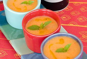 Avec les légumes à pleine maturité de cette fin d’été, voilà un gazpacho andaluz rafraichissant et bien chargé de leurs saveurs. Pour cela, il est important de laisser mariner les légumes coupés avec l’huile et le vinaigre avant de les broyer, afin que leurs arômes puissent mieux se mêler et se diffuser ensuite. Est-ce la qualité des légumes, l’étape ‘marinade’, ou cette très bonne huile d’olive de Provence (aux olives espagnoles dans cette édition limitée du Moulin de Callas)... le résultat était divin: belle consistance de la soupe, et explosion d’arômes frais des légumes d’été. A consommer sans modération jusqu’à la fin de saison!