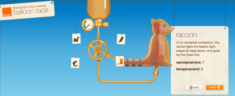 Orange, que pourtant je ne porte pas dans mon cœur en France (des mois à m’installer mes différentes lignes, du quinzième jusqu’à Saint Ouen, plus un entourage curieusement victime du même syndrome, je ne crois pas au hasard…), m’a pourtant cette fois-ci séduit (sisi). PLAYBALLONCY ! L’idée : tu te crées un petit personnage / animal en ballon “virtuel”, et celui-ci devra aller le plus loin possible : il passera à travers de nombreux sites / blogs (tu peux inscrire le tien pour qu’il fasse partie du parcours). Le winner aura naturellement un prix très sympa. J’ai donc choisi comme monture un raton-laveur. Parce que je le vaux bien :