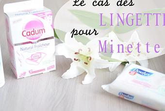 En bonne hôtesse qu'elle est, Minette se doit toujours d'être fraîche et propre, prête à accueillir des visites inopinées. Pour cela rien de mieux que des ablutions complètes. Il arrive parfois qu'il faille dévoiler la salle de jeux expressément et dans ce cas, des êtres dotés d'une intelligence supérieure ont pensé à tout : les lingettes à Minette. Mon expérience montre qu'il est inutile d'investir dans les grandes marques puisque les lingettes de marques distributeur sont tout aussi qualitatives pour un prix modique. Je ne suis cependant pas archi-convaincue par ces morceaux fibreux générant des déchets considérables ( on en produit déjà bien assez avec nos tampons et nos couches ), leur préférant largement le déodorant à Minette, qui contre toute attente, se révèle bien plus sympa à utiliser, moins polluant et qui dure longtemps ( je suis d'accord : c'est pas ton déo qui t'enlèvera le morceau de PQ coincé là-où-faut-pas mais bon... )