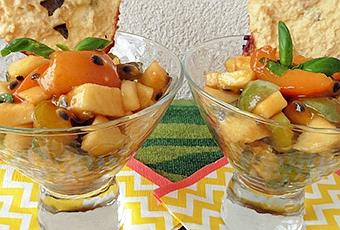 1° Préparez les fruits. Pelez la pomme, lavez les autres fruits. Taillez-les fruits en petits dés. Prélevez la pulpe des fruits de la passion. Versez le tout dans un saladier en ajoutant des brins de basilic et mélangez. Réservez au frais jusqu'au service.