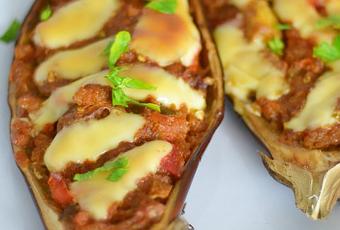 - Une fois la farce cuite, garnir les aubergines. Déposer le fromage sur le dessus ( gruyère, parmesan râpe, toastinette etc .. )