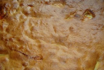- Montez les blancs en neige ferme avec une pincée de sel puis ajoutez les délicatement au mélange précédent à l'aide d'une spatule. Versez dans le moule sur les pommes. Faire cuire 30 minutes à four chaud 200° (à adapter à votre four).