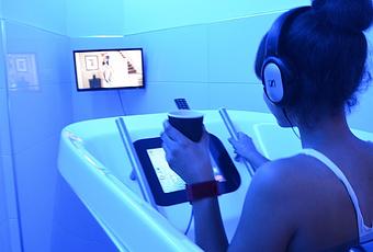 Je rentre dans la cabine. Elle ferme la porte derrière moi. Elle m'allume la TV, me donne la télécommande et me montre le casque. Elle m'attache un bracelet de sécurité. En effet si vous glissez, vous allez tirer sur le bracelet, et la machine va s'arrêter instantanément. C'est un bon point sécurité. Elle m'allume la machine et m'explique comment marche l'écran tactile. Vous pouvez régler les jets d'eau (j'en avais sur les fesses et les genoux), la vitesse du tapis, et la couleur de l'eau ! Au fur et à mesure, il y a un décompte pour savoir combien de temps il vous reste et en même temps vous avez le nombre de km parcourus !