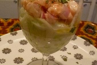 Emincez l’oignon. Mélanger les crevettes coupées en morceaux dans un bol, ajoutez le jus de citron vert, 4 CS d’huile d’olive, l’oignon.