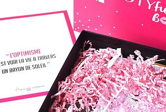 A l'ouverture, je découvre la fiche du mois avec une citation qui annonce le thème du mois : "l'optimisme". Ensuite, je tombe sur les produits protégés dans des petites confettis rose : si ça ce n'est pas une box girly je n'y comprend rien ! ^^
