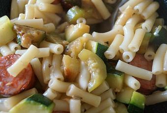 Cette recette est plus à vrai dire quelques pistes d'assemblage de restes ou comment faire avec deux trois trucs, un plat de Pâtes complet. Pour un Dîner, simple et rapide, un soir de semaine. A vous d'utiliser un reste de Légumes cuisinés, un reste de Saucisses-Chorizo-Merguez cuits au BBQ durant le week-end, également quelques morceaux de Fromages qui "trainent" dans votre frigo. Seules les Pâtes sont cuites au dernier moment ...