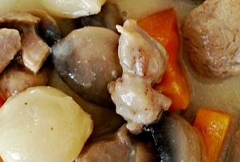 Enlevez vos morceaux de viande, passez le bouillon au chinois et remettez sur le feu. Ajoutez les carottes pour 20 minutes de cuisson, ajoutez les champignons et les oignons grelots à mi-cuisson.