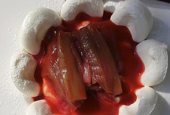 Voilà un petit dessert pour profiter des dernières tiges de rhubarbe du marché avant de rentrer dans l'automne . Il est réalisé avec des pétales de meringue croustillante , une crème à la vanille et des tiges de rhubarbe cuite dans un sirop à la framboise et un coulis de framboises . Vous pouvez réaliser les éléments séparément et préparer les assiettes au moment de les servir .