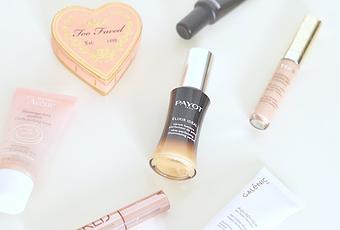 Elixir Idéal Payot / Gommage Doux Purifiant Avène / Réparateur Intensif Yeux Académie Scientifique de Beauté / Gel-Crème Aquapulpe Galénic=> Elixir Idéal de Payot (45€, 30ml) est comme sa description l'indique un sérum lumière perfecteur de teint. Je commence avec mon favoris de tous les temps, j'ai reçu ce sérum avant mes vacances et c'est un réel coup de coeur, je l'utilise chaque matin sur mon visage propre et sec. Le sérum Elixir Idéal est composé d'extrait de litchi (mon fruit préféré), il apporte éclat, bonne mine, hydratation et c'est un puissant anti-oxydant qui permet de combattre les effets du vieillissement. Il contient aussi de la vitamine C qui éclaircit, régule, lisse et unifie le teint et améliore l'élasticité de la peau et enfin il y a aussi de la poudre soft focus qui apporte un fini doux peau de pêche et qui réfléchit la lumière.Son flacon pompe est très pratique et hygiénique, une ou deux pompes que je répartis sur mon visage et j'étire sur mon cou. Le résultat sur moi est vraiment TOP, une peau hydratée juste ce qu'il faut, lisse et souple, il est vraiment parfait pour les personnes qui n'aiment pas des crèmes trop présentes sur la peau dès le matin. Bref coup de coeur pour ce sérum.
