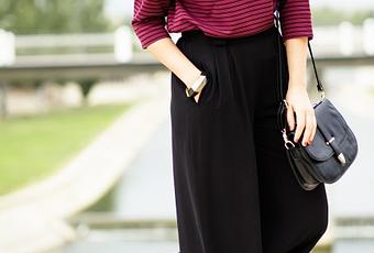 Aujourd’hui, une silhouette comme je les aime, graphique, ludique et structurée ! Une taille haute, des volumes amples mais équilibrés, une dégaine un poil canaille aux couleurs contrastées. Du rouge sur mes lèvres, du rouge sur mes ongles.. Des rayures noires x bordeaux sur ce très très chouette sweat à la coupe carrée x oversized.. Et pour trancher, du noir en accessoires x palazzo. Avec les quelques (euphémisme!) kilos pris durant les mois qui viennent de s’écouler, cette forme de pantalon extra large et fluide dite palazzo est ma parfaite alliée pour dissimuler/cacher les miennes en détournant l’attention vers une taille marquée et un stretching des jambes ! Astuce !