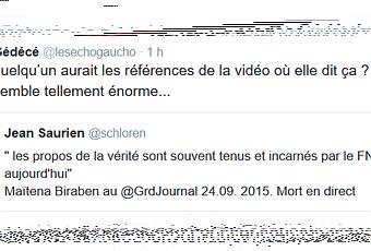 Et donc, à plusieurs reprises, sur Télé Bolloré, dont on connait les sympathies sarkozystes, lequel est si proche des positions lepénistes sur certains sujets, pour Maïetena Biraben, et cela à plusieurs reprises, « Les français se reconnaissent dans ce discours de vérité qui est celui du FN ». Voilà un bel exercice, dans les actes, de dédiabolisation par les médias dominants, de ce parti d’extrême droite… Et après, on s’étonnera de la chute d’audience de cette émission si médiocre… Quand j’ai appris cela, je l’avoue, j’avais du mal à y croire, il a fallu que je m’assure de la source :