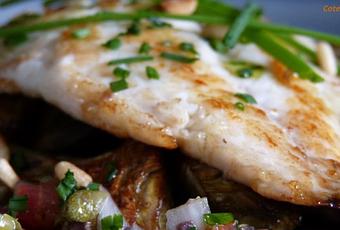 Dressez les plats en déposant les artichauts puis le filet de poisson par dessus. Nappez le tout de la sauce vierge et parsemez les assiettes, de pignons grillés. Servez aussitôt.