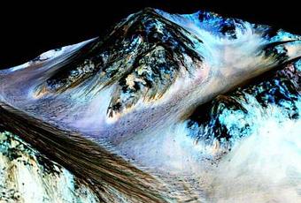 Et donc il y a de l'eau partout ?Non, on parle de zones bien spécifiques, où se trouvent des "RSL", des sortes de coulées noires qui apparaissent, en général à flanc de montagne. Elles sont situées dans des régions bien spécifiques, mais plus d'une douzaine ont été observées grâce à la sonde spatiale américaine MRO, lancée en 2005. Depuis 2010, des chercheurs ont commencé à analyser ces données.