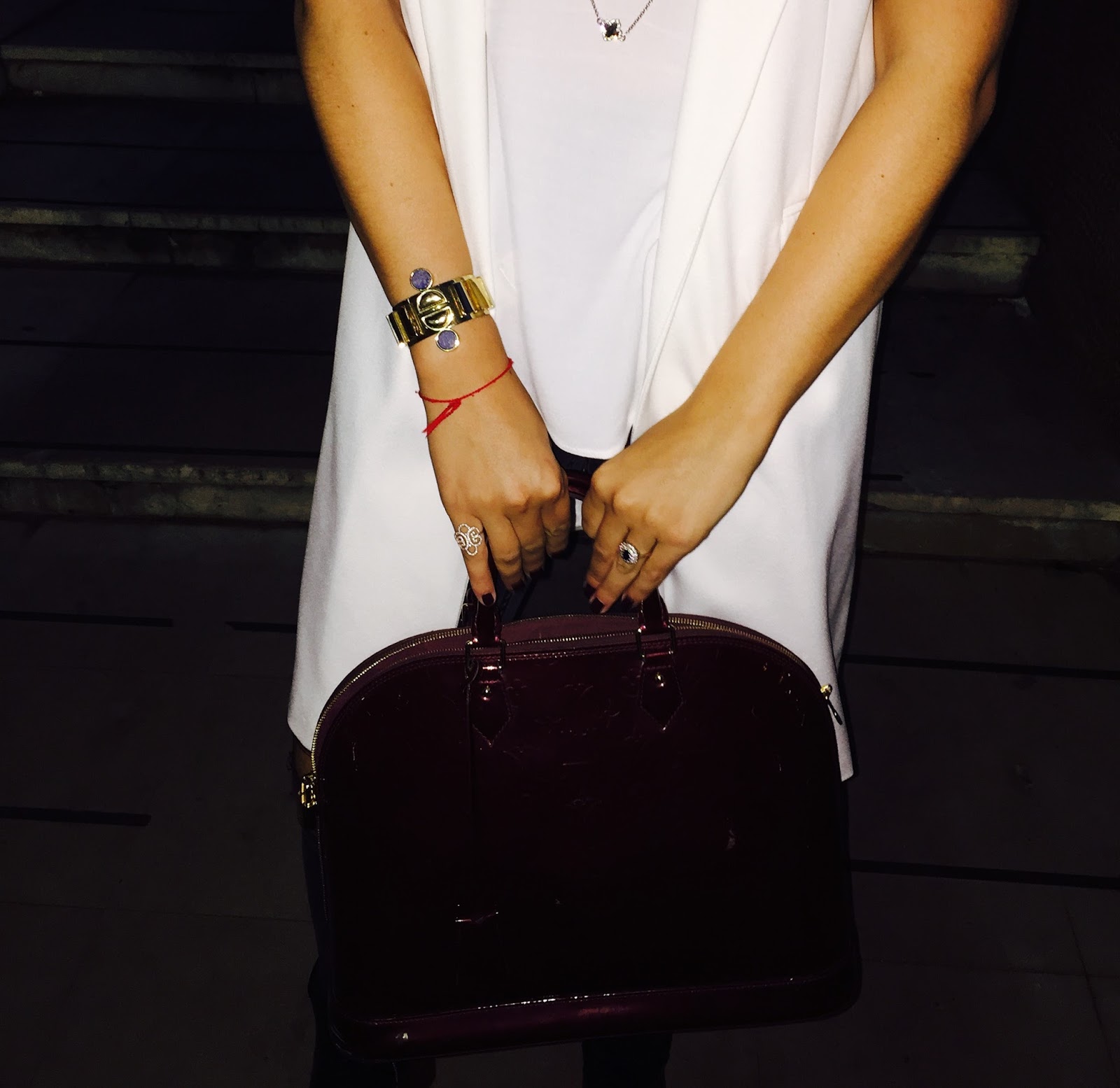 Pour contrer le graphisme de ma tenue, j'ai adopté mon sac fétiche couleur lie de vin (une belle teinte pour l'automne) ainsi que des bijoux plus dessinées...