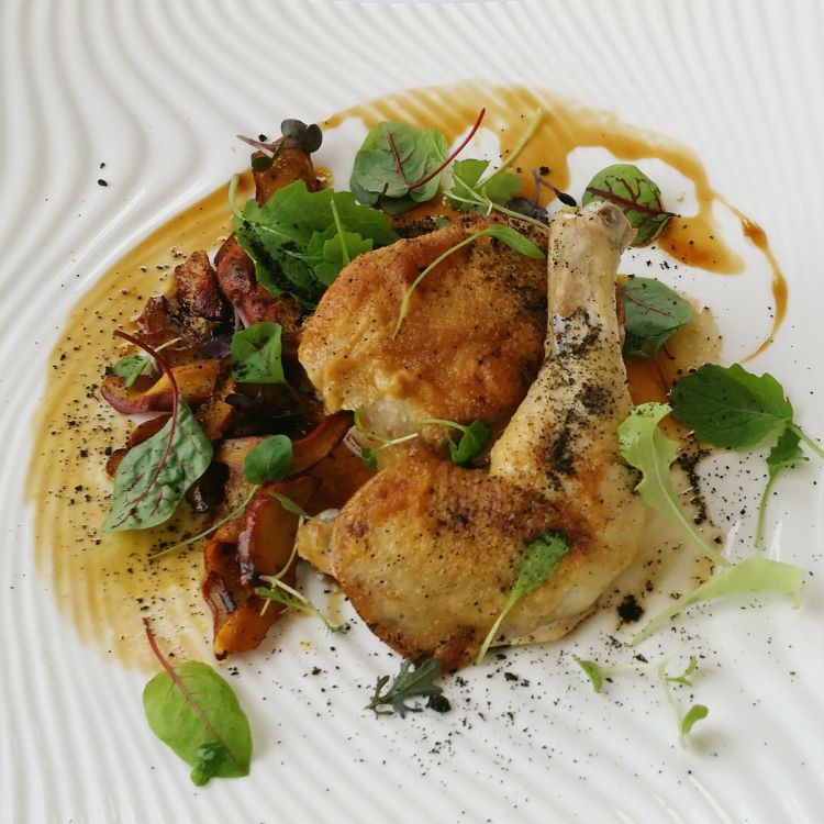 ˜ Le médaillon de foie gras au torchon maison, son crousti-fondant d’une langoustine. Pain brioché et caramel aux agrumes ˜ Pétoncles XXL caramélisés sur roche, sauce hoisin. Son risotto crémeux au vin blanc forestier Ou Poule de Cornouailles rôtie au jus et cuite au foin. Crousti-fondant de légumes racines ˜ Le mi-cuit chocolat coulant et fondant. Crème glacée vanille et éclats de meringues ˜ Prière à Sainte Culpabilité : Macarons, mignardises et friandises