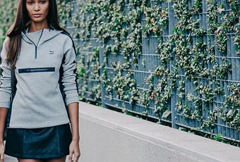 Joan Smalls est l’une des mannequins du moment que j’apprécie le plus. Une vraie beauté. Ici, elle mixe parfaitement le sweat de sport Puma avec une pièce plus féminine, la mini-jupe en cuir.