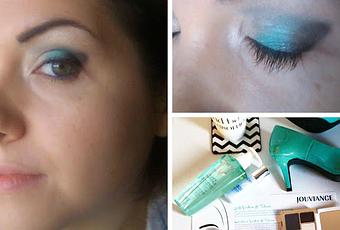 J'ai d'abord appliquer Jouviance Restructiv qui donne un boost de collagène, puis le fond de teint Jouviance (corrige et traite la peau). Ensuite j'ai appliqué le quatuor Veston & Talon comme sur la fiche technique maquillage que j'ai reçu avec l'envoie médias de la collection Veston &Talon! Le quatuor comporte des ombres à paupières très riche en pigment, soyeuse, longue durée et la couleur turquoise est tellement vibrante (ça tombe bien avec mon power trip de turquoise, de la paire de soulier avec la déco allant jusqu'au accent de couleur de mon blog... Pis une cravate grise et turquoise à Simon) et j'ai été charmée par le look sophistiqué. Et le quatuor, c'est toujours génial car ça permet d'avoir diverse agencement. J'ai terminé mon look Veston et Talon avec le mascara Sur Mesure.