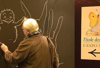 Vous aurez reconnu Claude Ponti sur la photo, en train de dessiner ses fameux poussins. L'expo est ouverte du 1er octobre 2015 et 7 février 2016.