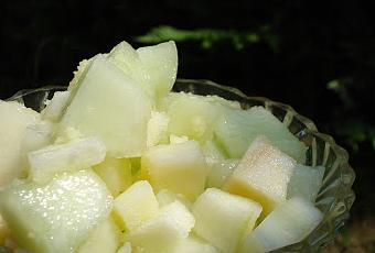 Il fait chaud! ça y est l'été est arrivé !Oui... mais il fait chôôôôôôôôôôôô ! Et c'est juste ho-rrib-le !Parce qu'on a pas eu le temps de s'habituer.Qu'est ce qu'on pourrait manger, histoire de se rafraichir, mais sans tomber dans les sorbets ou glaces hyper sucrés ? Une jolie salade de fruits rafraîchissante, fruitée et pimentée juste ce qu'il faut.J'utilise des melons canari ou vert, pas chers, mais pas franchement gouteux. D'où la nécessité de les relever un peu, avec du citron vert et jaune, du gingembre, des pommes... Sachant tout de même que si vous ne connaissez pas le gingembre frais, épice chaude et piquante, je vous recommande vivement de tester avant. Moi j'adore ça, alors quand j'en utilise, je ne le fais pas à la légère, mais pour des néophytes, le choc pourrait être un peu violent. ☺
