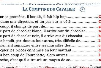 L'ouvrage est destiné à celles et ceux qui souhaitent apprendre rapidement les règles de notre jeu. Thierry y regroupe l'essentiel, ce qu'il est absolument indispensable de savoir pour se lancer dans ses premières parties. Et, de façon tout à fait originale je trouve, c'est au moyen de comptines qu'il se propose de transmettre cette base à ses lecteurs - les plus jeunes certainement - avant d'entamer des chapitres plus conséquents, comme les rudiments de l'attaque et de la défense, par exemple. Quand j'étais minot, je me souviens que nous avions l'habitude de chanter des petites comptines pour apprendre les règles de français. Nous chantions aussi nos tables de multiplication et il paraîtrait que les écoliers allemands, eux, chantent leur alphabet. Mémoriser les paroles simples d'une comptine favorise l'apprentissage grâce à l'aspect tout à fait ludique que cela peut revêtir. Je pense que nous en avons tous fait l'expérience. La comptine a traversé nombre de générations et je me doute que Thierry a du éprouver lui-même la méthode auprès de ses propres élèves avant d'en faire l'objet d'une édition.