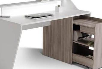 Le bureau connecté Cinlou mesure 139x91x65,2 cm. Il est associé à un caisson sur roulettes mesurant 59,9x67,9x38,4 cm.