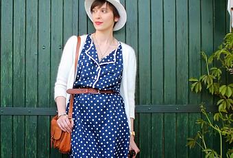 Robe à pois vintage, cardigan angora Zara et chapeau chinés 2 euros en friperieBoots en daim - ZaraCartable - SabrinaCeinture piquée à mon homme