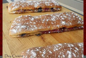 - Sur la moitié de la pâte, côté le moins large, répartir des fruits rouges (encore surgelés) puis replier dessus la moitié de pâte sans fruit afin d'obtenir un rectangle. Appuyer sur les bords pour les souder entre eux.