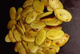 Les placer dans une poêle sans matière grasse. Laisser griller en surveillant bien. En fin de cuisson, mettre le curcuma et le sel. Réserver et déguster à l’apéritif.