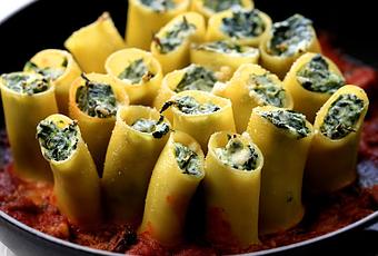 Cette semaine , il commence à faire froid à Moscou , 6/7° dans la journée et 2° la nuit et même les premiers flocons aujourd'hui (très peu mais quand même on ressent bien la froid ) alors il faut se réconforter et manger des plats sympathiques . Rien de tel que des pâtes pour être en forme ... J'ai toujours aimé faire des canneloni épinards/ricotta je trouve que c'est une bonne façon de manger des épinards quand les enfants sont un peu retissants . Là je vous propose une version dans des gros tubes de pâtes des "paccheri" , je trouvais que présenter dans ce sens ils étaient amusants . Pour que les pâtes ne soient pas dures je préfère les cuire avant dans l'eau bouillante salée par contre laissez les refroidir avant de les farcir sinon la chaleur ferait couler la farce .