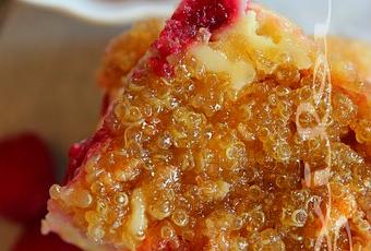3)Dans un autre bol, mettre le reste des ingrédients, sauf les framboises. Mélanger, puis verser sur la base de quinoa. Garnir de framboises. Parsemer avec le mélange de quinoa réservé.