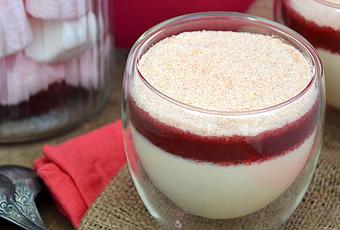A vant de servir, versez une couche de coulis de framboise et saupoudrez du reste de poudre de macarons amande.