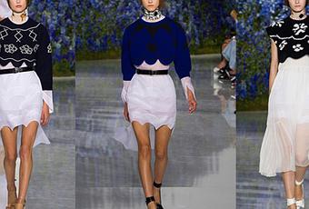 L’allure fraîche, romantique, singulière des mannequins Dior, vêtues de déshabillés blancs coupés dans un coton immaculé que l’on pourrait croire emprunté à un habit de religieuse. Raf Simons leur assortit de courts pulls en jacquard de laine brute à torsades et aux bords découpés en corolles, une très belle association qu’il relève de tours du cou en gros-grain.