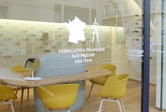 Un jaune plus que présent, pour un shop tout en courbes, venant reprendre celles des montures présentées. Mobilier, galets, miroirs, chaise, on immerge le potentiel client dans l'univers de la marque.