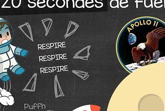 C’est Neil Armstrong qui pilote le module lunaire (Lunar Module – LM, ou LEM en français – c’est le petit engin qui se détache du gros module de commande en orbite autours de la Lune, pour finir le trajet et se poser à sa surface). Ă€ cause des bugs du pilote automatique qui l’envoie sur des rochers, il passe en manuel et dévie sa trajectoire pour trouver un site adapté à l’alunissage 7 kilomètres plus loin. La manĹ“uvre l’oblige à consommer plus de carburant que prévu et il se pose finalement avec juste 20 secondes de fuel restant pour l’alunissage (d’essence quoi – et plus précisément de propergol qui est le carburant des fusées)… chaud.