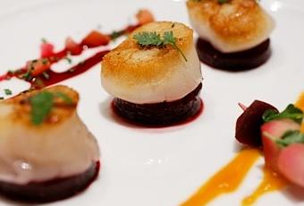 Fiche technique : Noix de coquilles Saint-Jacques aux betteraves cuites épicées, sel vanillé de Tahiti, moulures de graines de paradis, mini-brochette croquante